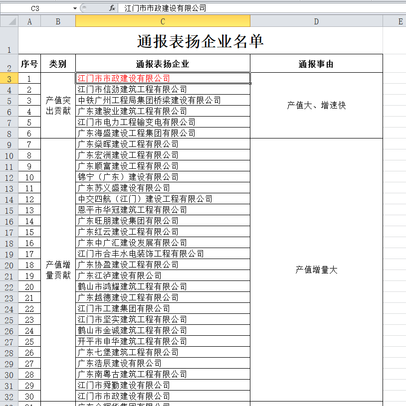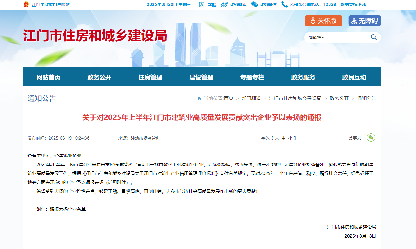 类别名称: 江门市住房和城乡建设局:与江门市房屋市政建设有关市场行为、质量安全以及与市建筑业高质量发展相关方面的通报表扬