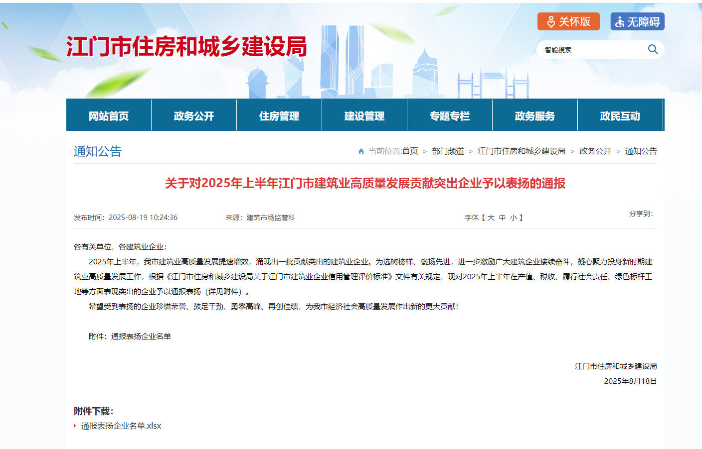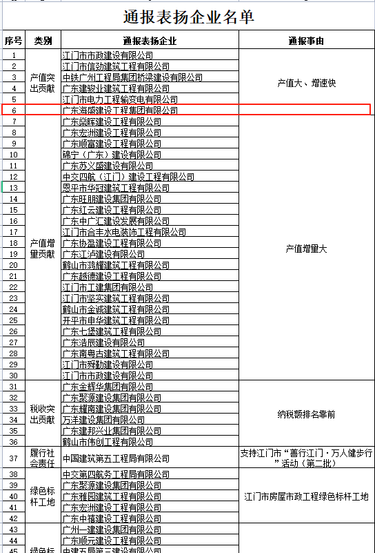 | 类别名称: | 江门市住房和城乡建设局:与江门市房屋市政建设有关市场行为、质量安全以及与市建筑业高质量发展相关方面的通报表扬 |