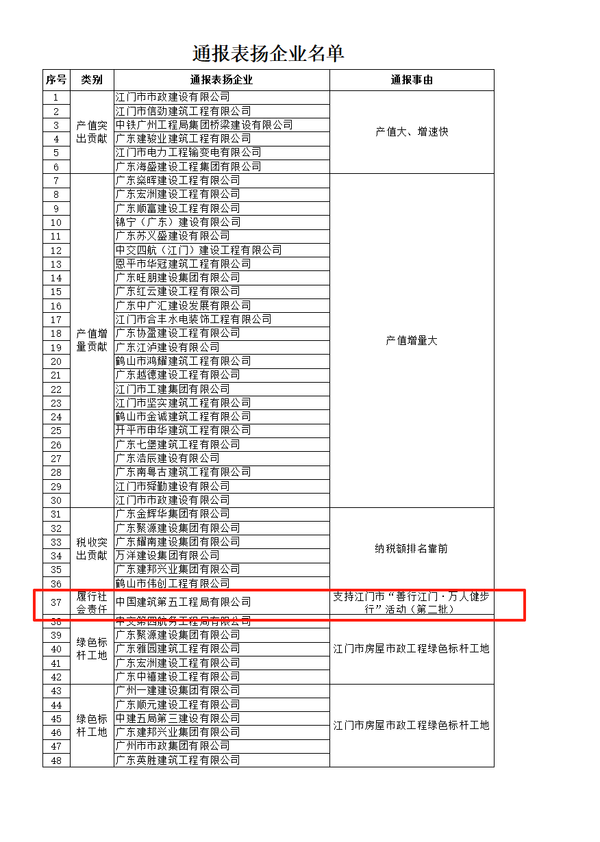 | 类别名称: | 江门市住房和城乡建设局:与江门市房屋市政建设有关市场行为、质量安全以及与市建筑业高质量发展相关方面的通报表扬 |