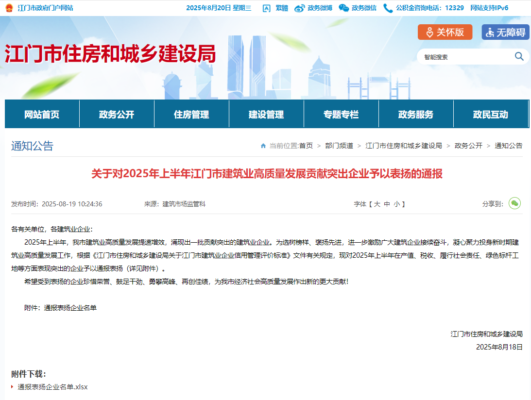 | 类别名称: | 江门市住房和城乡建设局:与江门市房屋市政建设有关市场行为、质量安全以及与市建筑业高质量发展相关方面的通报表扬 |