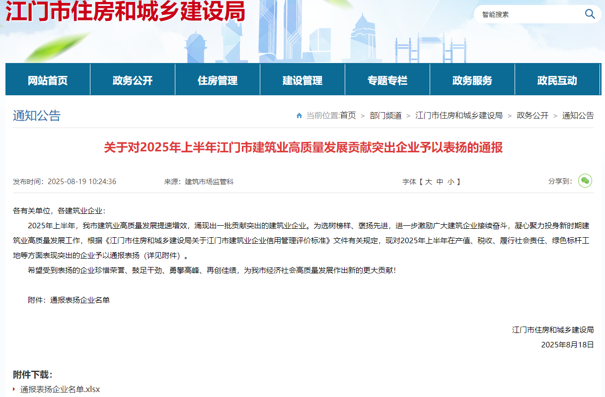 | 类别名称: | 江门市住房和城乡建设局:与江门市房屋市政建设有关市场行为、质量安全以及与市建筑业高质量发展相关方面的通报表扬 |