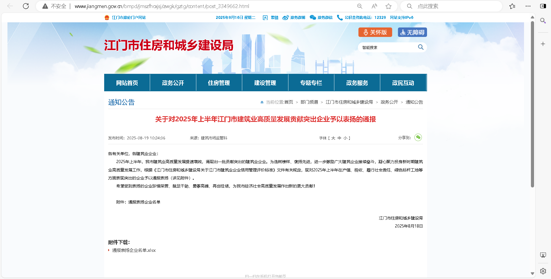| 类别名称: | 江门市住房和城乡建设局:与江门市房屋市政建设有关市场行为、质量安全以及与市建筑业高质量发展相关方面的通报表扬 |