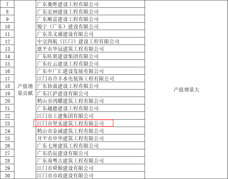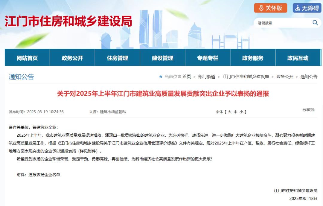 | 发文编号: | 关于对2025年上半年江门市建筑业高质量发展贡献突出企业予以表扬的通报 |