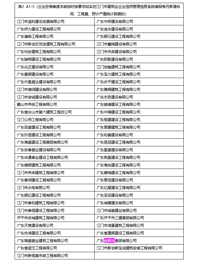 | 类别名称: | 企业在每季度末前按时按要求如实在江门市建筑业企业信用管理信息系统填报每月新增合同、工程量、预计产值统计数据的 |
