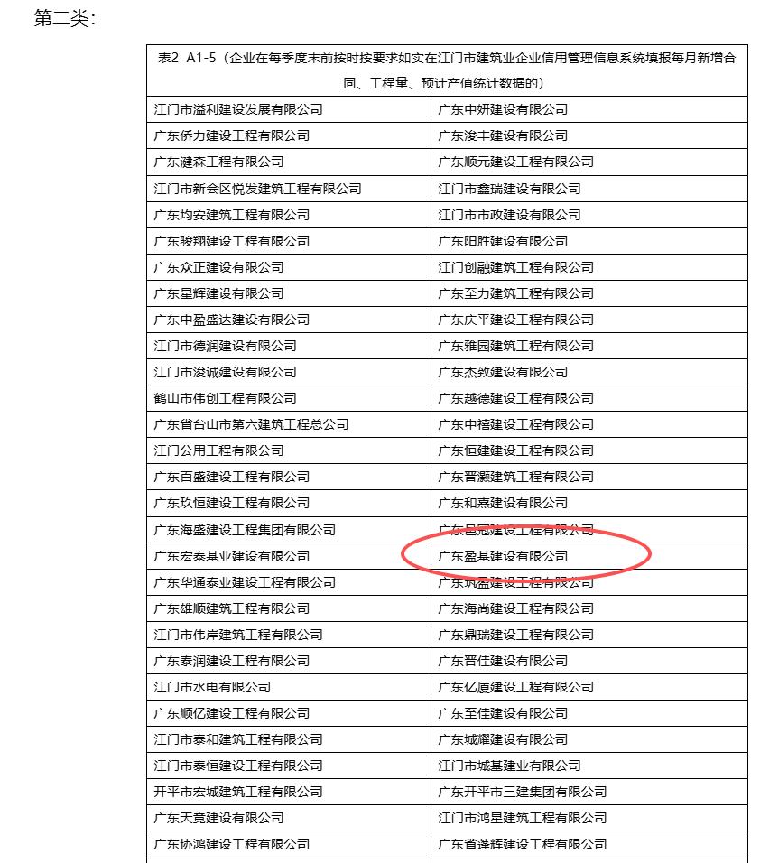 | 类别名称: | 企业在每季度末前按时按要求如实在江门市建筑业企业信用管理信息系统填报每月新增合同、工程量、预计产值统计数据的 |