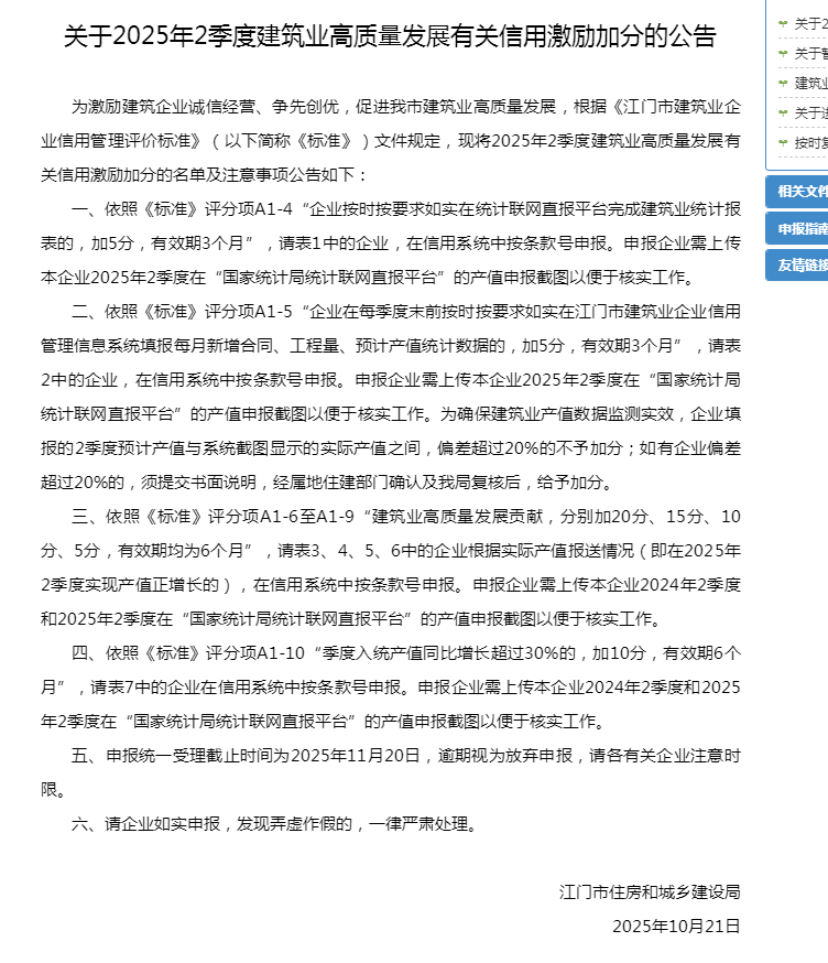 | 类别名称: | 企业在每季度末前按时按要求如实在江门市建筑业企业信用管理信息系统填报每月新增合同、工程量、预计产值统计数据的 |