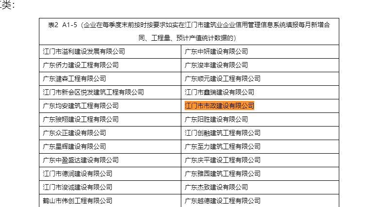 | 类别名称: | 企业在每季度末前按时按要求如实在江门市建筑业企业信用管理信息系统填报每月新增合同、工程量、预计产值统计数据的 |