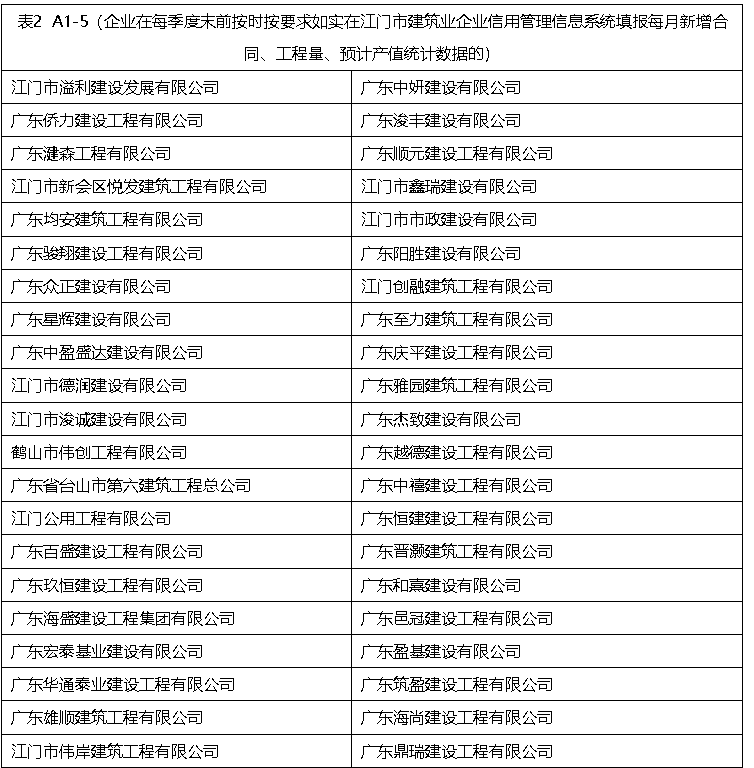 | 类别名称: | 企业在每季度末前按时按要求如实在江门市建筑业企业信用管理信息系统填报每月新增合同、工程量、预计产值统计数据的 |