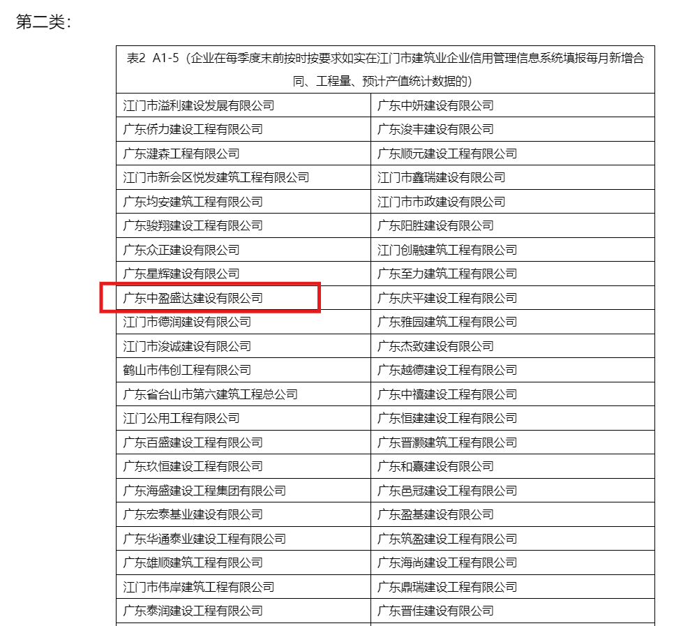 | 类别名称: | 企业在每季度末前按时按要求如实在江门市建筑业企业信用管理信息系统填报每月新增合同、工程量、预计产值统计数据的 |