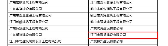 | 评价依据: | 在江门市建筑业企业信用管理 信息系统公布名单 |