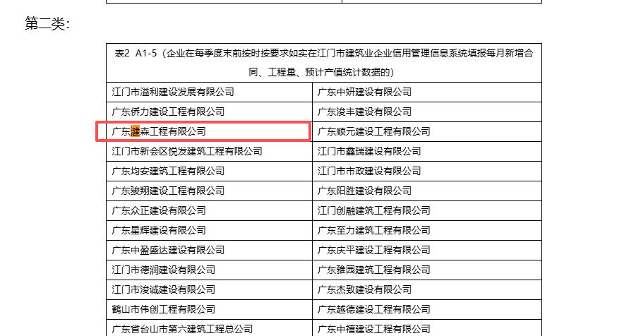 | 类别名称: | 企业在每季度末前按时按要求如实在江门市建筑业企业信用管理信息系统填报每月新增合同、工程量、预计产值统计数据的 |