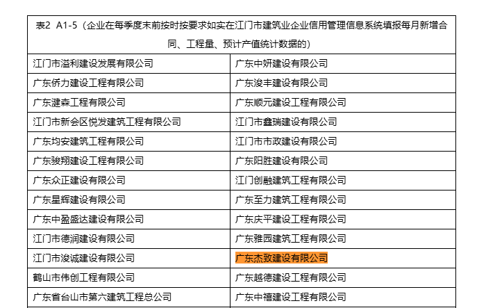 | 类别名称: | 企业在每季度末前按时按要求如实在江门市建筑业企业信用管理信息系统填报每月新增合同、工程量、预计产值统计数据的 |
