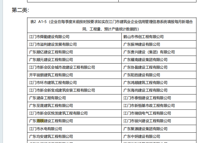 | 类别名称: | 企业在每季度末前按时按要求如实在江门市建筑业企业信用管理信息系统填报每月新增合同、工程量、预计产值统计数据的 |