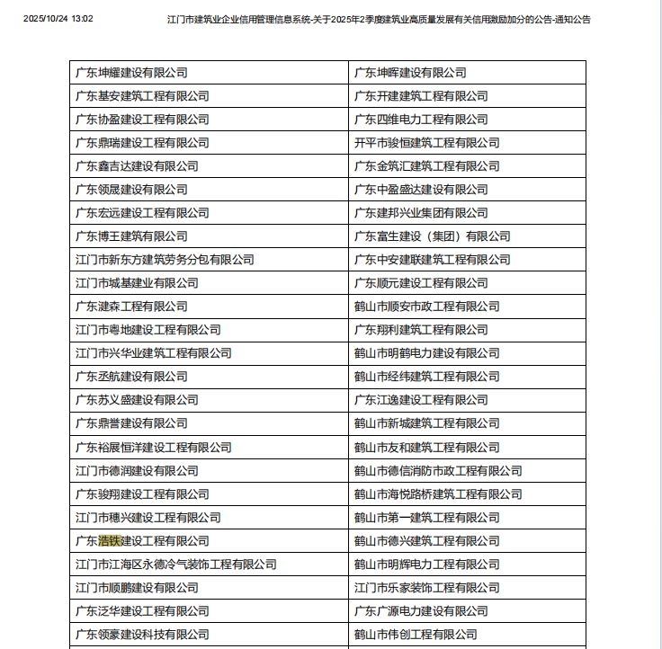 | 评价依据: | 在江门市建筑业企业信用管理 信息系统公布名单 |