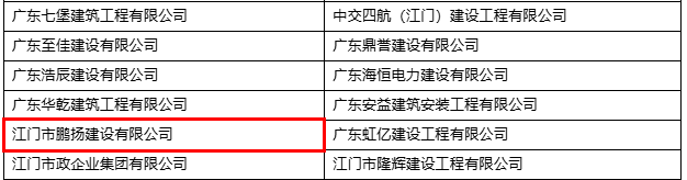 | 评价依据: | 企业自报,并在江门市建筑业企业信用管理信息系统公布名单 |