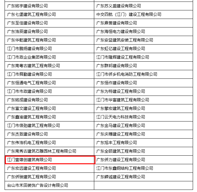 | 评价依据: | 企业自报,并在江门市建筑业企业信用管理信息系统公布名单 |