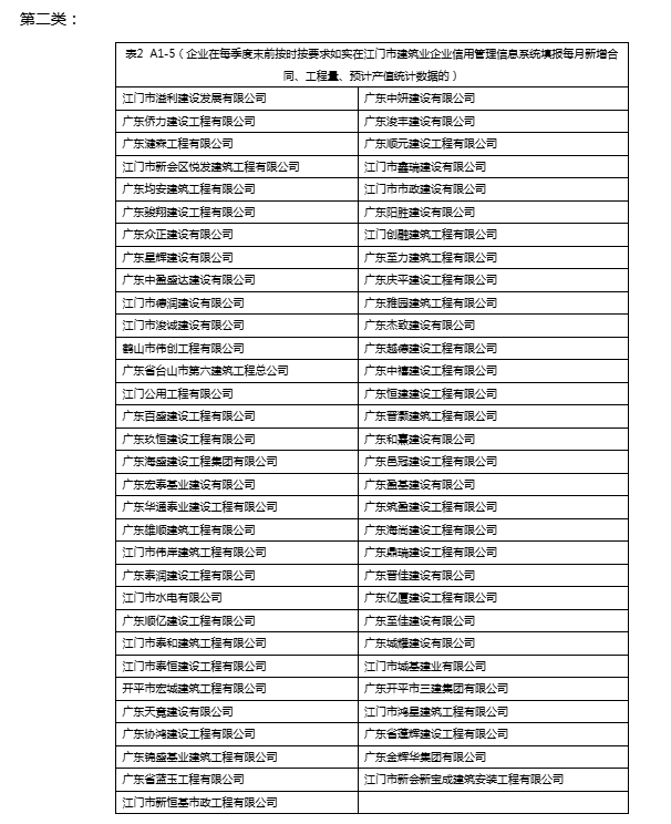 | 类别名称: | 企业在每季度末前按时按要求如实在江门市建筑业企业信用管理信息系统填报每月新增合同、工程量、预计产值统计数据的 |