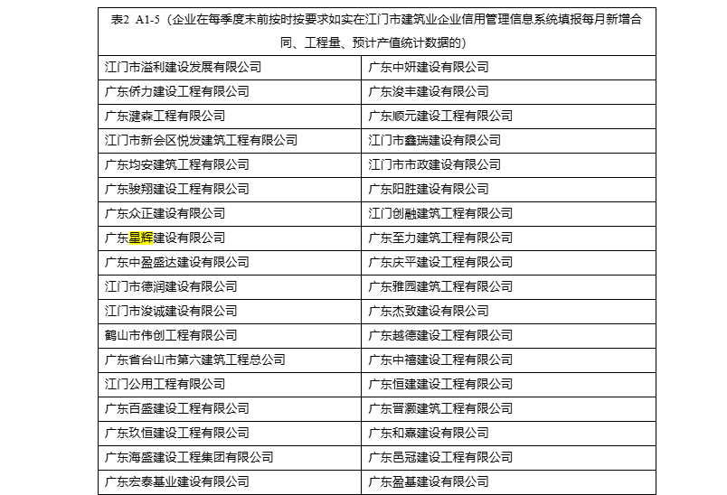 | 类别名称: | 企业在每季度末前按时按要求如实在江门市建筑业企业信用管理信息系统填报每月新增合同、工程量、预计产值统计数据的 |