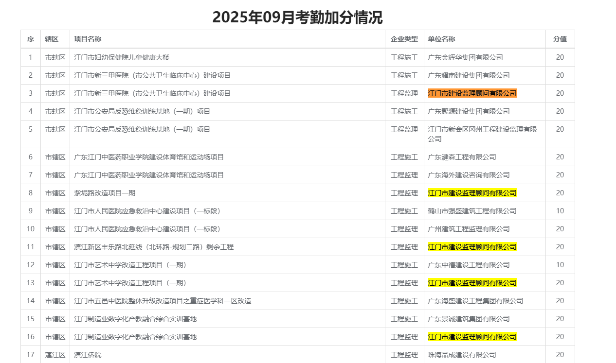 | 类别名称: | 对纳入实名制管理的房屋市政项目,总监理工程师和专业监理工程师在一个月内均达到以下在岗率,企业可申请加分(人员在岗率计算:在岗天数/当月天数)80%≤人员在岗率 |