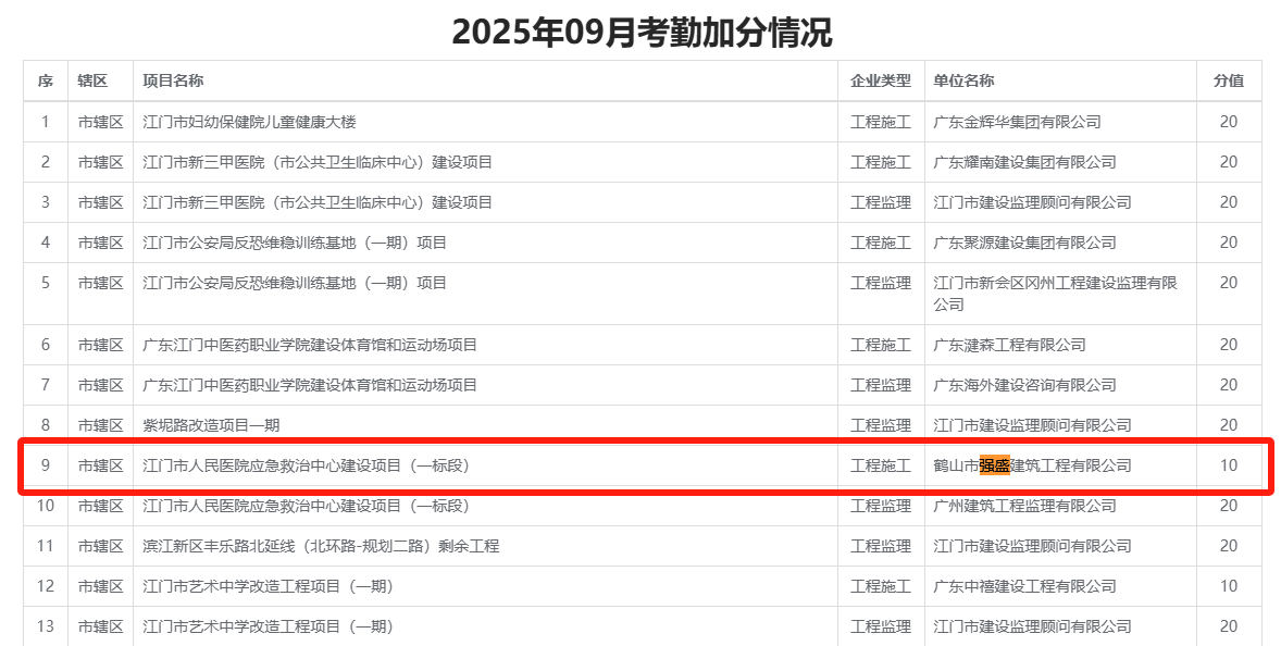 | 发文编号: | 关于2025年9月份全市在建项目主要管理人员实名制考勤信用评价情况的公告 |