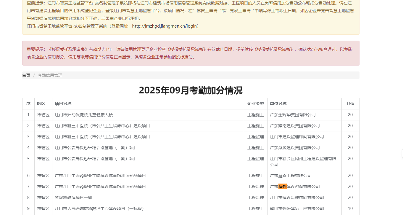 | 类别名称: | 对纳入实名制管理的房屋市政项目,总监理工程师和专业监理工程师在一个月内均达到以下在岗率,企业可申请加分(人员在岗率计算:在岗天数/当月天数)80%≤人员在岗率 |