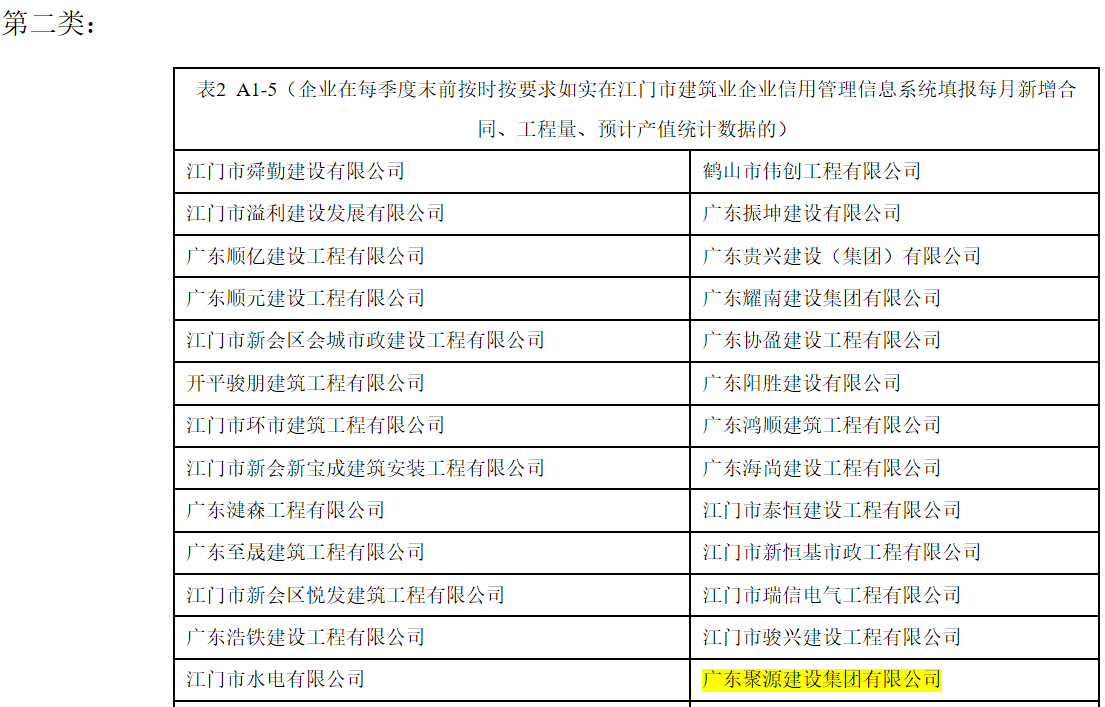 | 类别名称: | 企业在每季度末前按时按要求如实在江门市建筑业企业信用管理信息系统填报每月新增合同、工程量、预计产值统计数据的 |