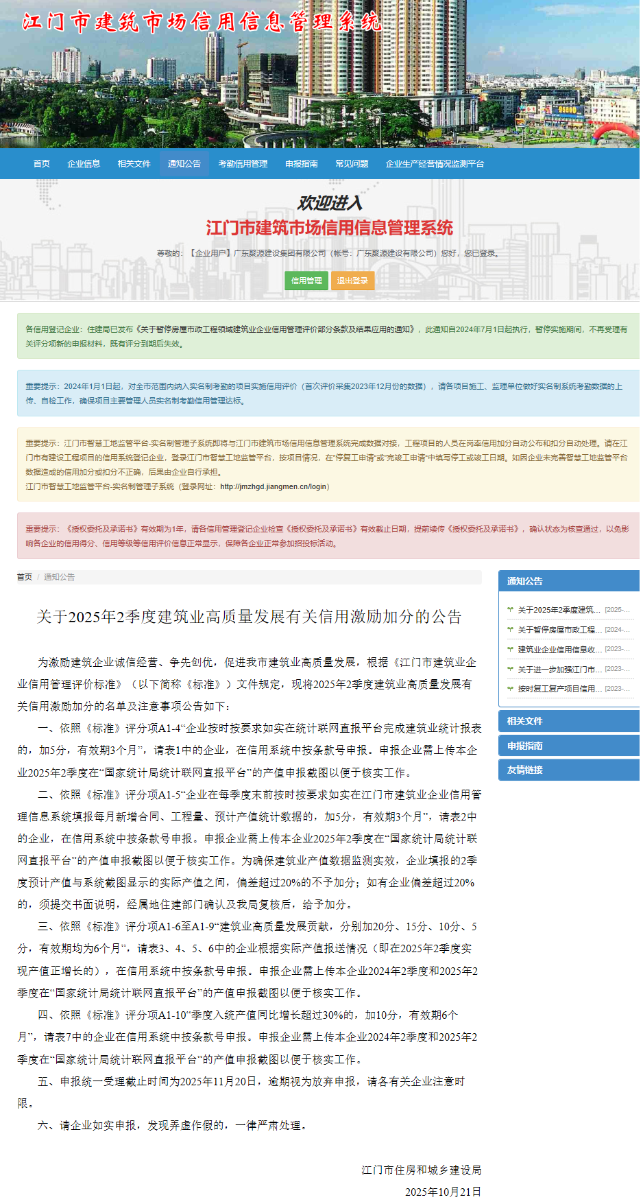 | 评价依据: | 企业自报,并在江门市建筑业企业信用管理信息系统公布名单 |
