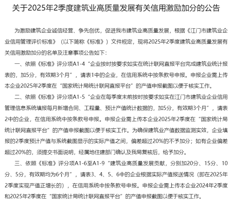 各信用登记企业:住建局已发布《关于暂停房屋市政工程领域建筑业企业信用管理评价部分条款及结果应用的通知》,此通知自2024年7月1日起执行,暂停实施期间,不再受理有关评分项新的申报材料,既有评分到期后失效。