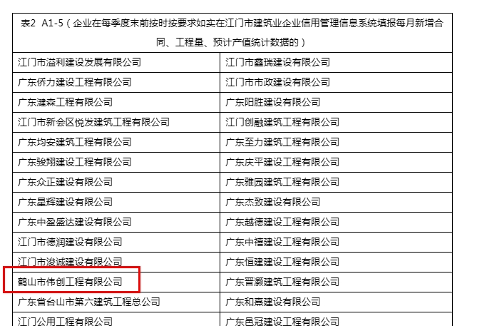 | 类别名称: | 企业在每季度末前按时按要求如实在江门市建筑业企业信用管理信息系统填报每月新增合同、工程量、预计产值统计数据的 |
