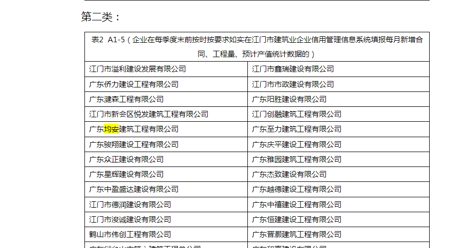 | 类别名称: | 企业在每季度末前按时按要求如实在江门市建筑业企业信用管理信息系统填报每月新增合同、工程量、预计产值统计数据的 |