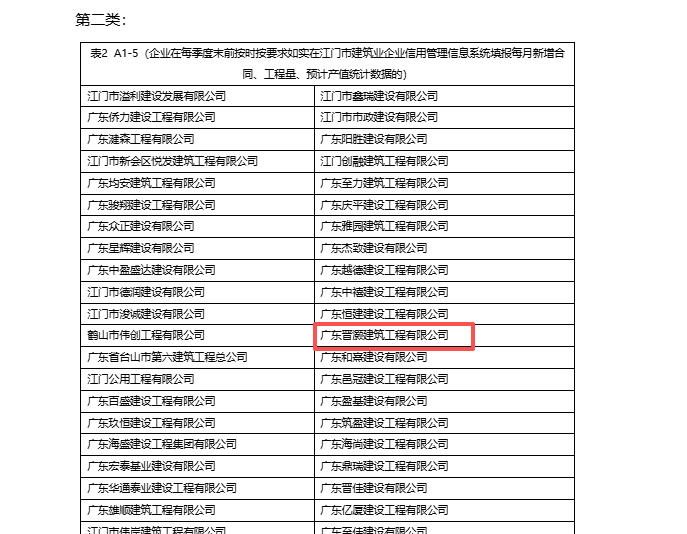 | 评价依据: | 根据填报情况在江门市建筑业企业信用管理信息系统公布名单 |