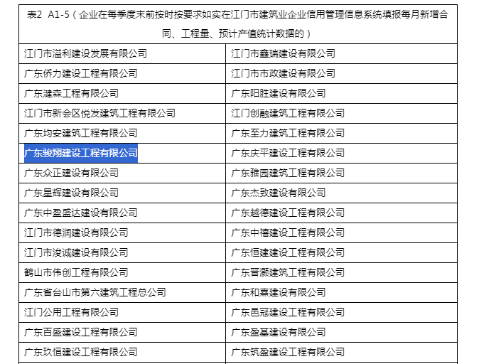 | 类别名称: | 企业在每季度末前按时按要求如实在江门市建筑业企业信用管理信息系统填报每月新增合同、工程量、预计产值统计数据的 |