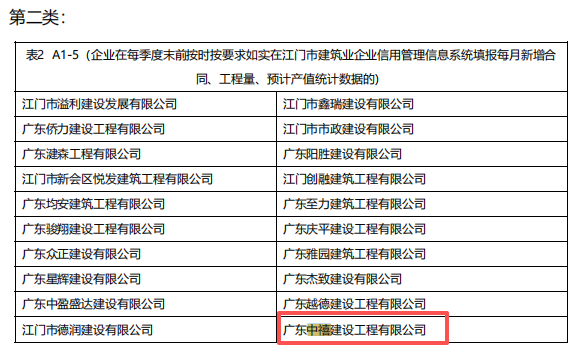 | 类别名称: | 企业在每季度末前按时按要求如实在江门市建筑业企业信用管理信息系统填报每月新增合同、工程量、预计产值统计数据的 |