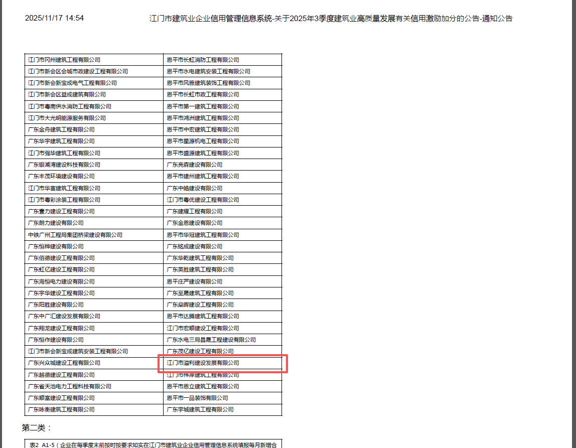 | 评价依据: | 在江门市建筑业企业信用管理 信息系统公布名单 |