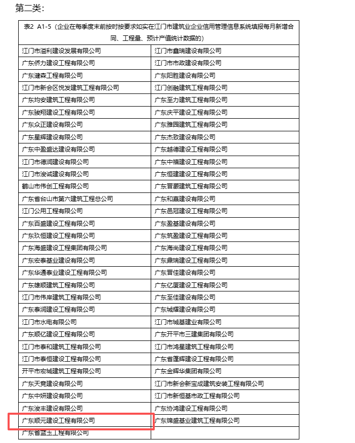 | 类别名称: | 企业在每季度末前按时按要求如实在江门市建筑业企业信用管理信息系统填报每月新增合同、工程量、预计产值统计数据的 |