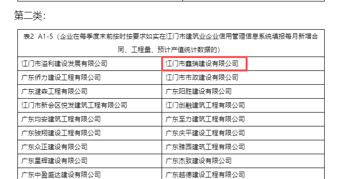 | 类别名称: | 企业在每季度末前按时按要求如实在江门市建筑业企业信用管理信息系统填报每月新增合同、工程量、预计产值统计数据的 |