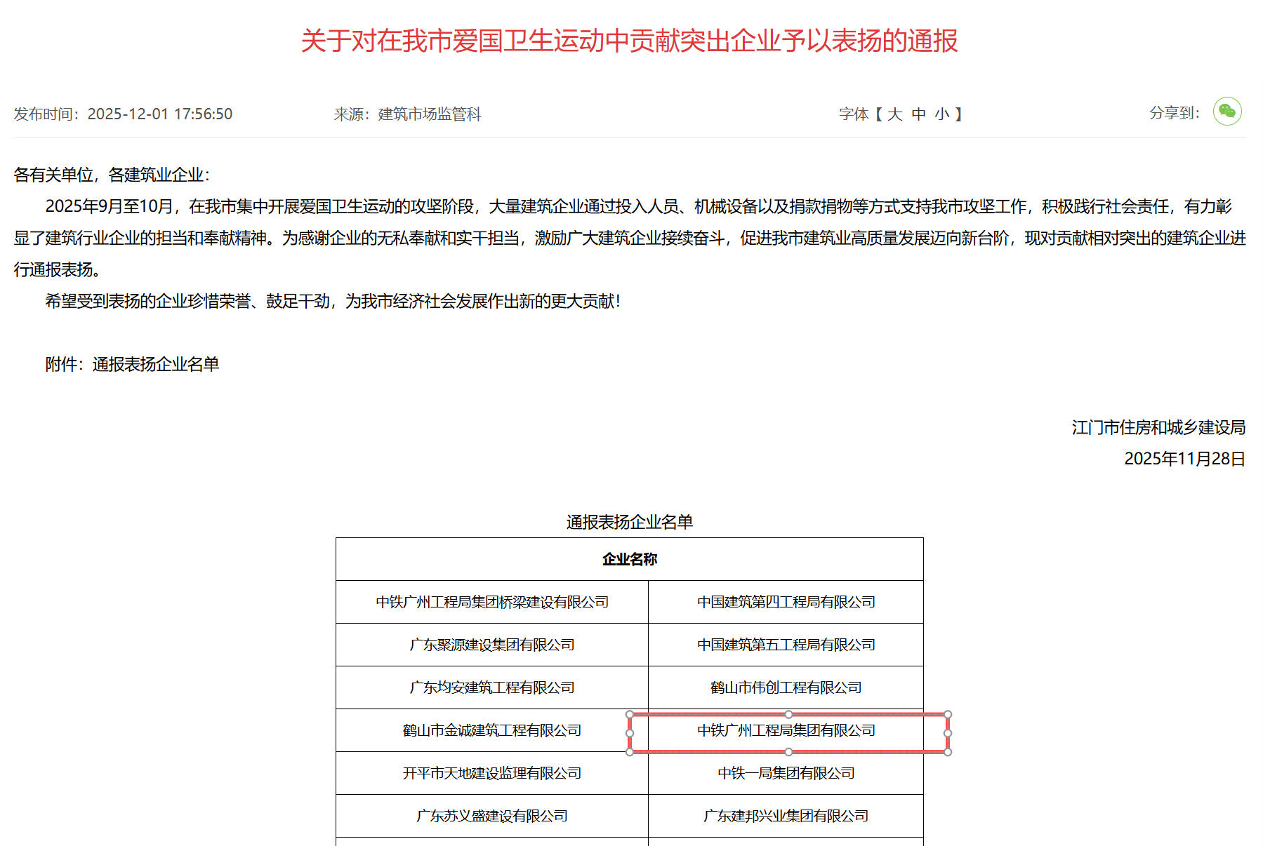 | 类别名称: | 江门市住房和城乡建设局:与江门市房屋市政建设有关市场行为、质量安全以及与市建筑业高质量发展相关方面的通报表扬 |