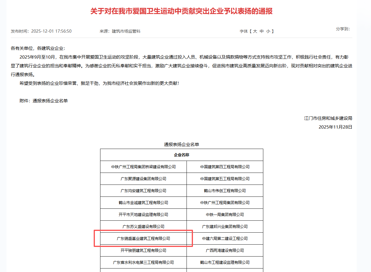 | 类别名称: | 江门市住房和城乡建设局:与江门市房屋市政建设有关市场行为、质量安全以及与市建筑业高质量发展相关方面的通报表扬 |