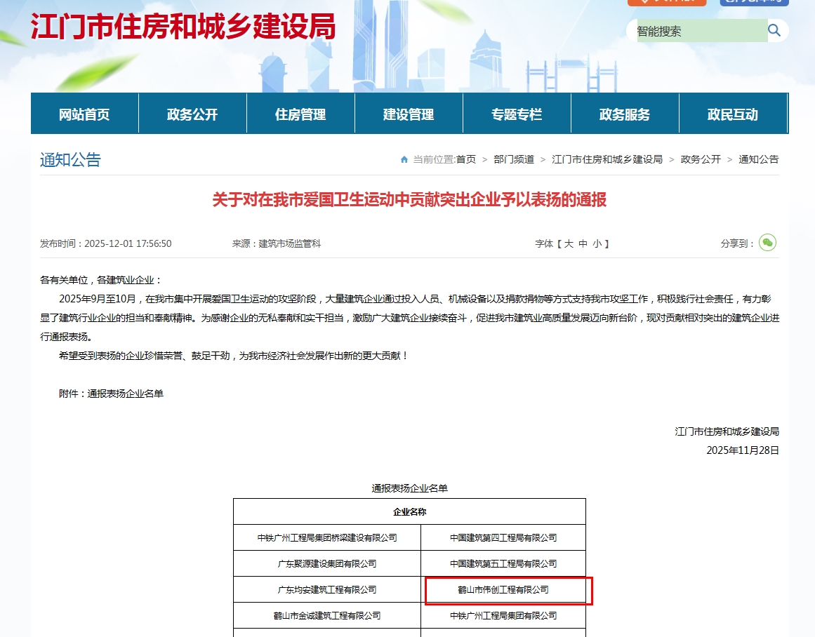 | 类别名称: | 江门市住房和城乡建设局:与江门市房屋市政建设有关市场行为、质量安全以及与市建筑业高质量发展相关方面的通报表扬 |