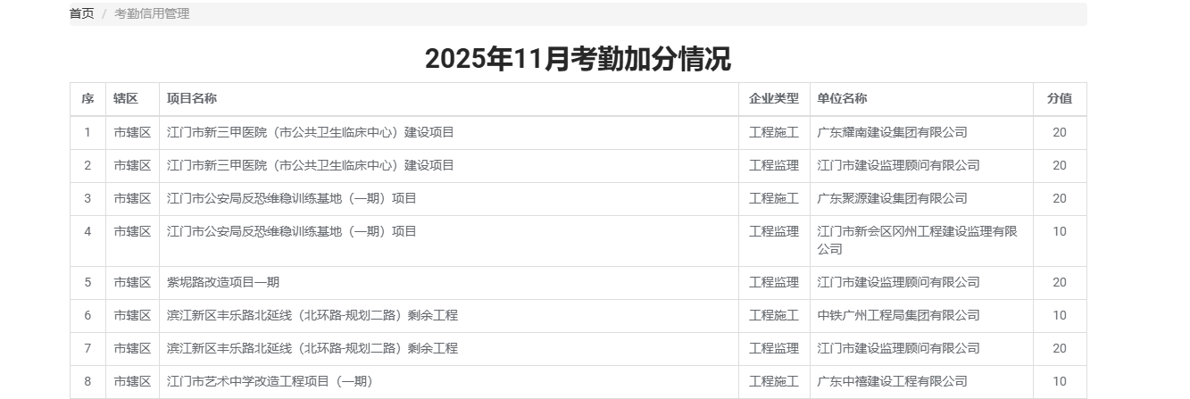 | 类别名称: | (人员月在岗率及人员月在岗时长=100%)对纳入实名制管理的房屋市政项目,项目负责人和专职安全员在一个月内均达到以下在岗率,企业可申请加分,上限150分。(最后计算结果四舍五入并精确到0.01)。人员月在岗率:当月在岗天数/当月应在岗天数,人员月在岗时长:当月在岗累计时长/当月工作日天数×8 |
