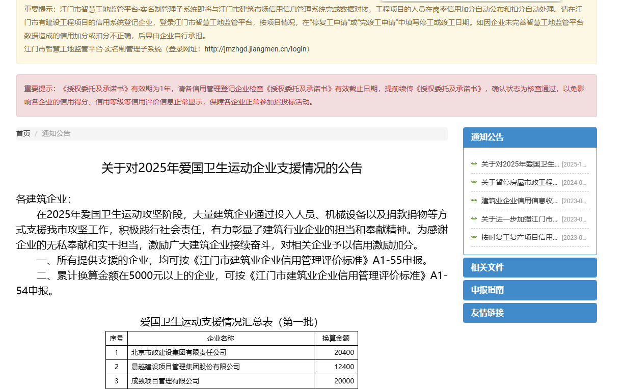 重要提示:江门市智慧工地监管平台-实名制管理子系统即将与江门市建筑市场信用信息管理系统完成数据对接,工程项目的人员在岗率信用加分自动公布和扣分自动处理。请在江门市有建设工程项目的信用系统登记企业,登录江门市智慧工地监管平台,按项目情况,在”停复工申请“或”完竣工申请“中填写停工或竣工日期。如因企业未完善智慧工地监管平台数据造成的信用加分或扣分不正确,后果由企业自行承担。