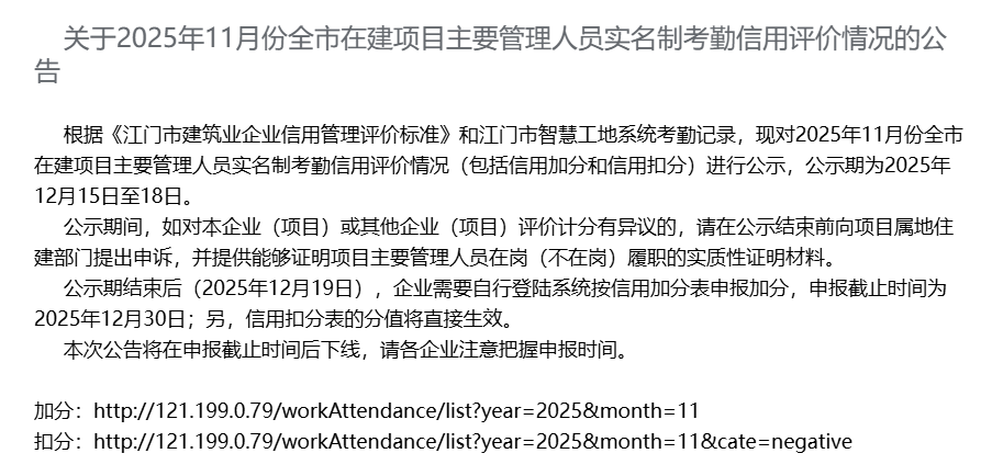 | 类别名称: | 对纳入实名制管理的房屋市政项目,项目负责人和专职安全员在一个月内均达到以下在岗率,企业可申请加分(人员在岗率计算:在岗天数/当月天数)90%≤人员在岗率<100% |
