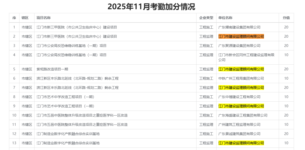 | 类别名称: | 对纳入实名制管理的房屋市政项目,总监理工程师和专业监理工程师在一个月内均达到以下在岗率,企业可申请加分(人员在岗率计算:在岗天数/当月天数)70%≤人员在岗率<80% |
