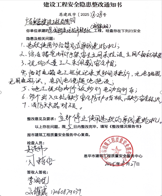 | 扣分原因: | 一个月内两次检查都发现使用简易式单线卷扬机,属于淘汰设备。 施工过程中发现存在同一类重大安全隐患2次及以上的 |