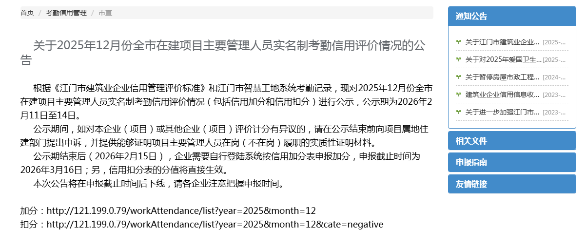 | 类别名称: | (人员月在岗率及人员月在岗时长=100%)对纳入实名制管理的房屋市政项目,项目负责人和专职安全员在一个月内均达到以下在岗率,企业可申请加分,上限150分。(最后计算结果四舍五入并精确到0.01)。人员月在岗率:当月在岗天数/当月应在岗天数,人员月在岗时长:当月在岗累计时长/当月工作日天数×8 |