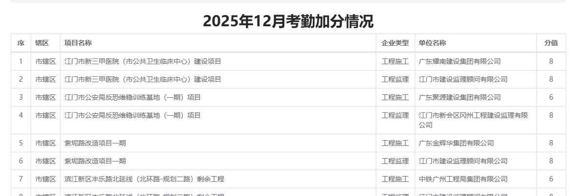 | 类别名称: | 90%≤人员月在岗率、人员月在岗时长,对纳入实名制管理的房屋市政项目,总监理工程师和专业监理工程师在一个月内均达到以下在岗率,企业可申请加分,上限150分。(最后计算结果四舍五入并精确到0.01)。人员月在岗率:当月在岗天数/当月应在岗天数,总监月在岗时长:当月在岗累计时长/当月工作日天数×2.5,专监月在岗时长:当月在岗累计时长/当月工作日天数×8。 |