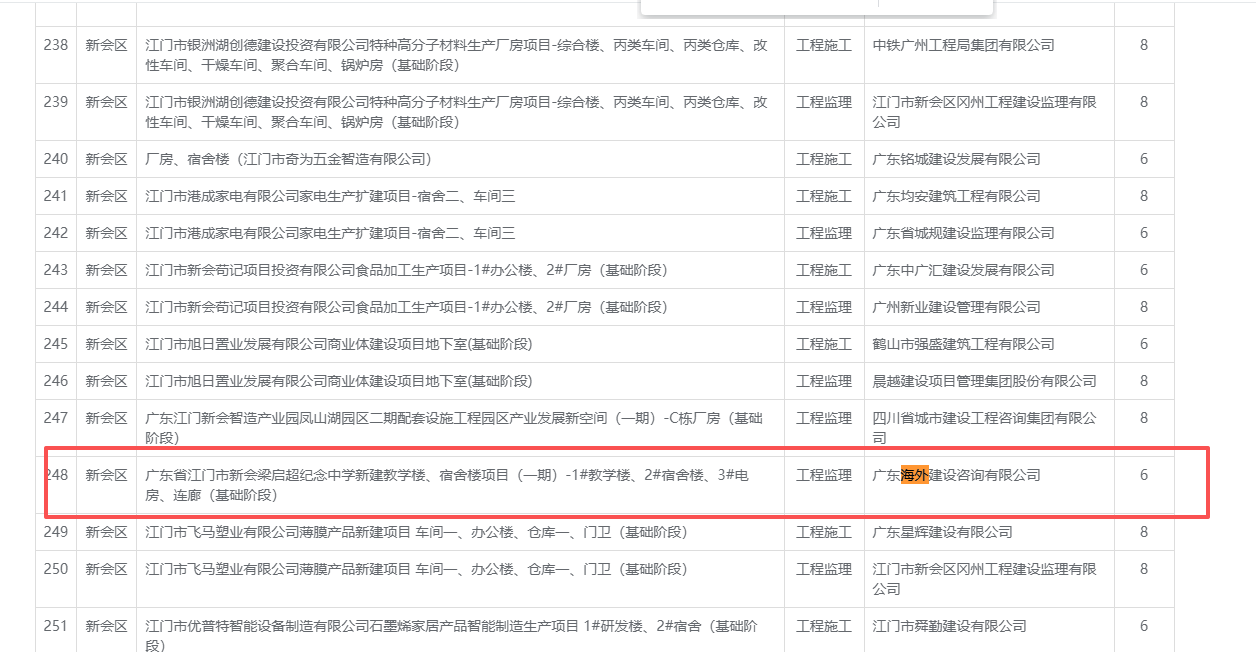 | 工程项目名称: | 广东省江门市新会梁启超纪念中学新建教学楼、宿舍楼项目(一期)-1#教学楼、2#宿舍楼、3#电房、连廊(主体阶段) |