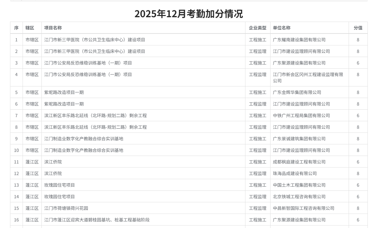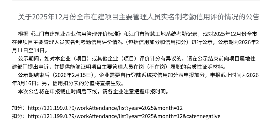 | 类别名称: | (人员月在岗率及人员月在岗时长=100%)对纳入实名制管理的房屋市政项目,项目负责人和专职安全员在一个月内均达到以下在岗率,企业可申请加分,上限150分。(最后计算结果四舍五入并精确到0.01)。人员月在岗率:当月在岗天数/当月应在岗天数,人员月在岗时长:当月在岗累计时长/当月工作日天数×8 |