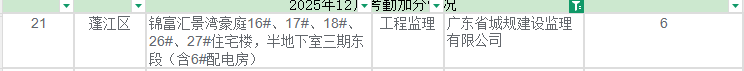 | 类别名称: | 75%≤人员月在岗率、人员月在岗时长<90%,对纳入实名制管理的房屋市政项目,总监理工程师和专业监理工程师在一个月内均达到以下在岗率,企业可申请加分,上限150分。(最后计算结果四舍五入并精确到0.01)。人员月在岗率:当月在岗天数/当月应在岗天数,总监月在岗时长:当月在岗累计时长/当月工作日天数×2.5,专监月在岗时长:当月在岗累计时长/当月工作日天数×8。 |