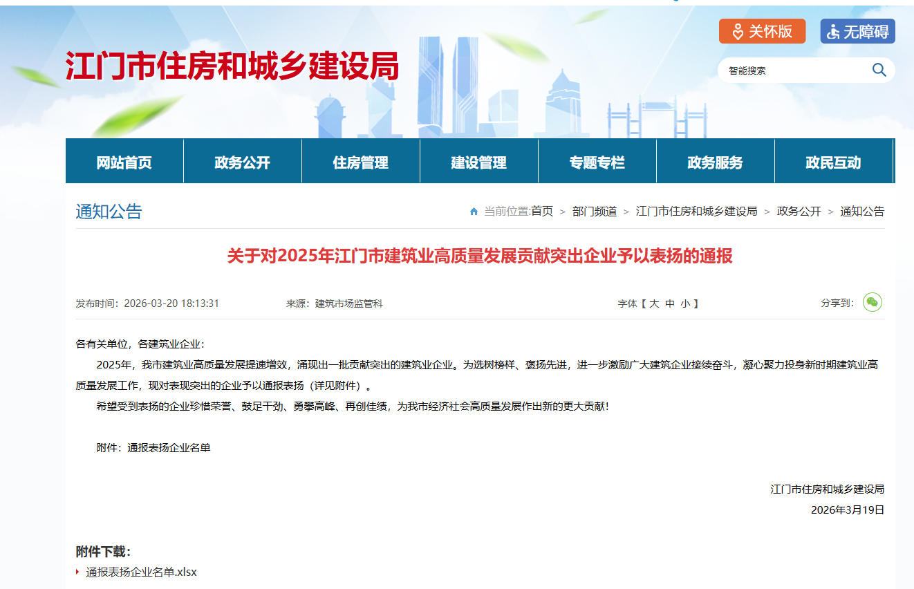 | 类别名称: | 市级住房城乡建设主管部门:与房屋市政工程建设有关市场行为、质量安全以及与市建筑业高质量发展相关方面的通报表扬 |